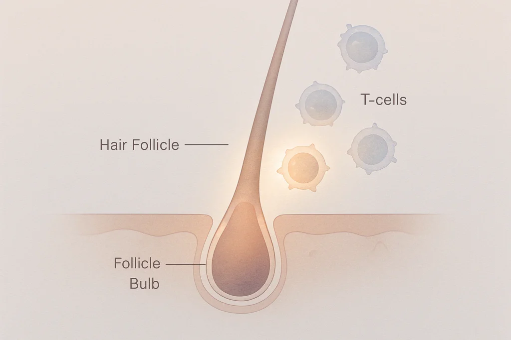 A hajtüszők normálisan immunprivilegizált struktúrák, ami azt jelenti, hogy az immunrendszer általában nem támadja meg őket. Az AA-ban ez az immunprivilegium elveszik, ami a hajtüszők elleni autoimmun támadáshoz vezet. A legújabb kutatások kimutatták, hogy az interferon-gamma (IFN-γ) által vezérelt immunválasz, beleértve az IFN-γ-indukált kemokineket és a citotoxikus CD8+ T-sejteket, kulcsszerepet játszik a betegség patogenezisében.