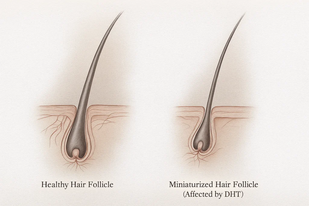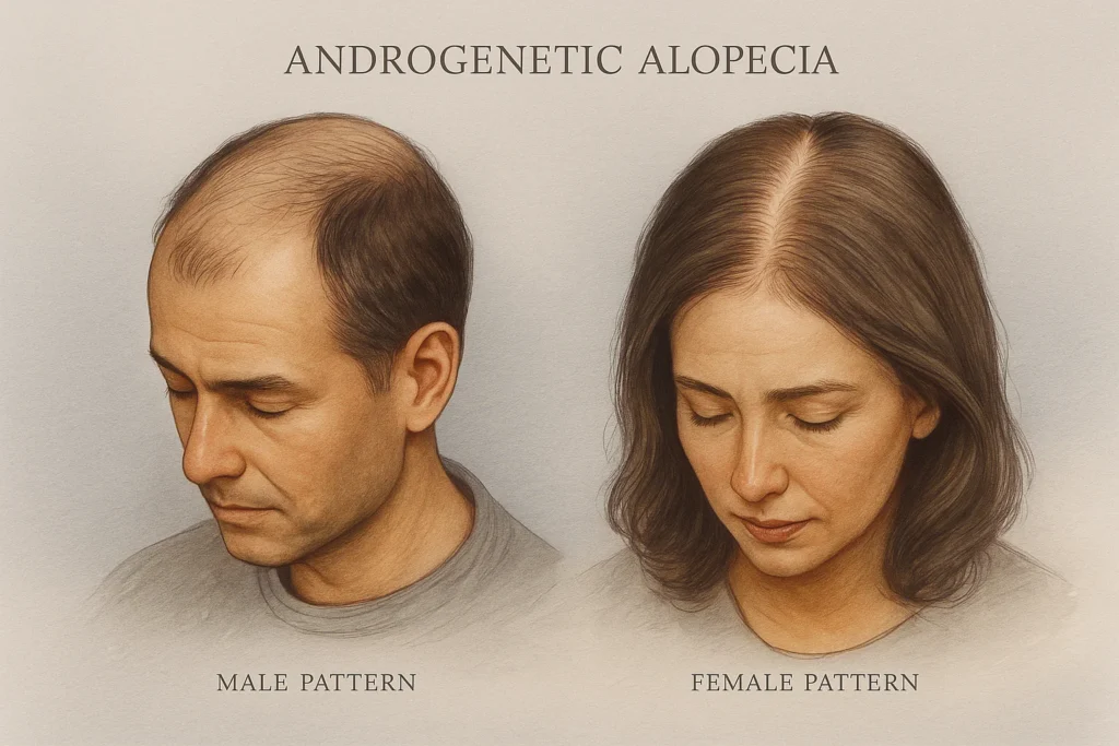 Az androgén alopecia — közismertebb nevén hormonális vagy örökletes hajhullás — a hajtüszők fokozatos gyengülésével jár, amelyet a DHT (dihidrotesztoszteron) nevű hormon vált ki. Férfiaknál klasszikus mintázatú kopaszodásként, nőknél pedig diffúz ritkulásként jelentkezik.